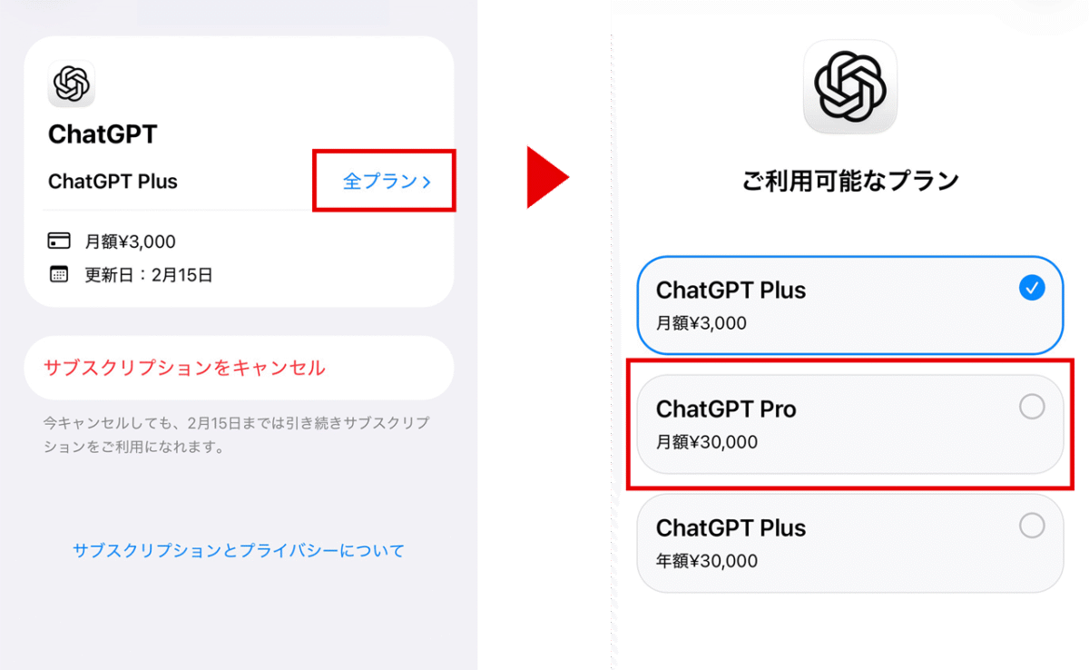 - iOSは「設定>サブスクリプション>ChatGPT>すべてのプランを表示」