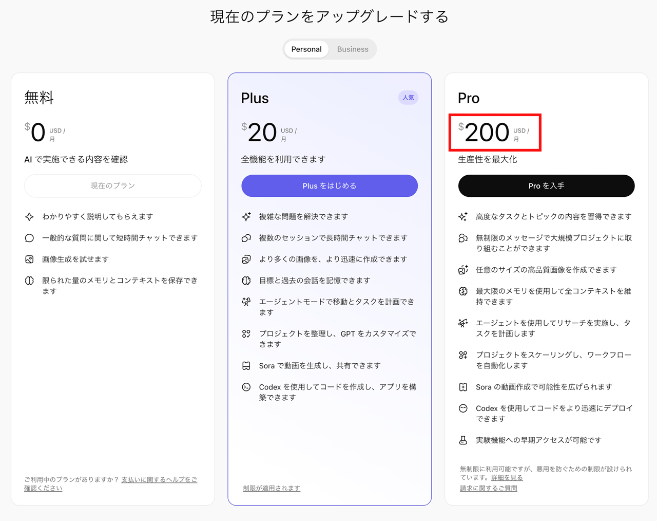 ChatGPTのサブスクリプション画面を開くと、現在は「ChatGPT Plus」にチェックが入っています。