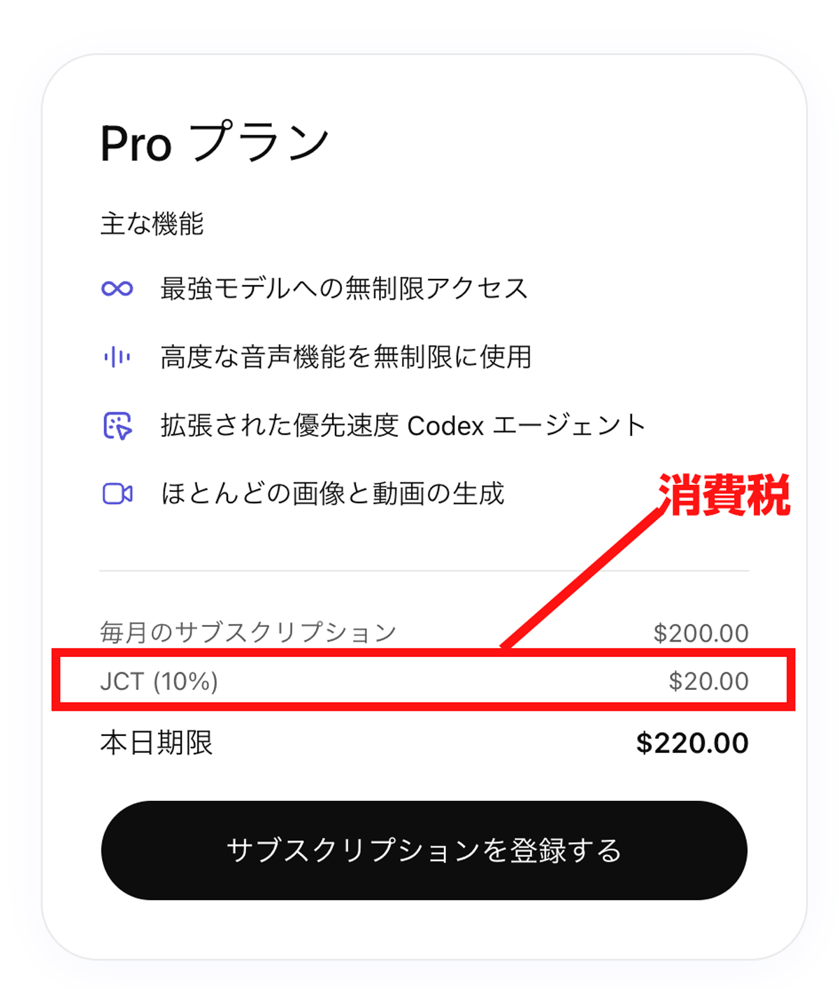 月額200ドル + 消費税 = 220ドル